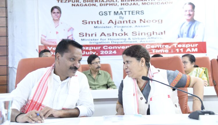 জিএছটি সন্দৰ্ভত তেজপুৰত মধ্য অসমৰ কেবাখনো জিলাৰ বাণিজ্য আৰু ব্যৱসায়ী সন্থাৰে বৈঠক মন্ত্ৰী অশোক সিংহল আৰু বিত্তমন্ত্ৰী অজন্তা নেওগৰ