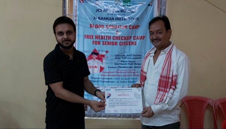 জেচিআই ৰঙিয়া ৰয়েলচৰ উদ্যোগত তথা জিএমচি হাস্পাতাল আৰু মা কামাখ্যা ডেন্টল ক্লিনিকৰ সহযোগত আজি ৰঙিয়াত ৰক্তদান আৰু বিনামূলীয়া স্বাস্থ্য পৰীক্ষন শিবিৰ অনুষ্ঠিত কৰা হয় । সংস্থাটোৱে অসহায় ৰোগী সকলৰ সহায় কৰাৰ উদ্দেশ্য এই ৰক্তদান শিৱিৰ আৰু বিনামূলীয়া স্বাস্থ্য পৰীক্ষণ শিৱিৰৰ আয়োজন কৰে। শিৱিৰত প্ৰায় ৪০ গৰাকী পুৰুষ আৰু মহিলাই ৰক্তদান কৰে। লগতে শতাধিক ব্যক্তিয়ে দন্ত আৰু মধুমেহ ৰোগৰ বিনামূলীয়া পৰীক্ষণ কৰায়। ৰক্তদাতা প্ৰতিজন ব্যক্তিক সংস্থাটোৰ ফালৰ পৰা একোখনকৈ প্ৰশংসা পত্ৰ আৰু লঘু আহাৰ প্ৰদান কৰা হয়।