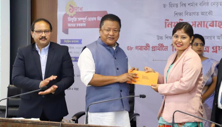এক লাখ নিযুক্তি প্ৰদানৰ প্ৰতিশ্ৰুতি সম্পূৰ্ণ কৰাৰ পদক্ষেপ স্বৰুপে উচ্চ শিক্ষা বিভাগৰ সঞ্চালকালয়ৰ অধীনত ৫৮ গৰাকী প্ৰাৰ্থীলৈ নিযুক্তি পত্ৰ প্ৰদান