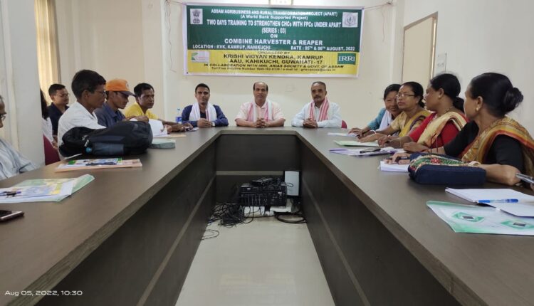 অসম চৰকাৰৰ কৃষি বিভাগৰ এপাৰ্ট প্ৰকল্পৰ উদ্যোগত গুৱাহাটীৰ পশ্চিম প্রান্তৰ আজাৰা কাঁহিকুছিস্থিত কৃষি বিজ্ঞান কেন্দ্ৰ, কামৰূপৰ চৌহদত ৫ আৰু ৬ আগষ্টত কৃষিকার্যত যান্ত্ৰিকীকৰণ বিষয়ক এক দুদিনীয়া প্ৰশিক্ষণ শিবিৰ অনুষ্ঠিত হৈ যায় । শিবিৰ উদ্বোধন কৰে কৃষি বিজ্ঞান কেন্দ্ৰৰ প্ৰধান বিজ্ঞানী ড০ ধীৰেন্দ্ৰ নাথ কলিতাই। অনুষ্ঠানত মুখ্য অতিথি হিচাপে উপস্থিত থাকে আই চি এআৰ সঞ্চালক ড০ ৰাজেশ কুমাৰ। শিবিৰত বিভিন্ন অঞ্চলৰ নিৰ্বাচিত ১৮ জন কৃষকে অংশ গ্ৰহণ কৰে। শিবিৰত সমল ব্যক্তি হিচাপে এপাৰ্ট প্ৰকল্পৰ সহযোগী ড০ মুনমী বৰা, আই.চি.আৰ.আৰ.আইৰ বিশেষজ্ঞ ড০ ৰোহিত নামদেওৱে উপস্থিত থাকি কম্বাইন হাৰ্ভেষ্টাৰ আৰু ৰিপাৰৰ বিষয়ে বিষদভাৱে ব্যাখ্যা আগবঢ়াই আৰু ইয়াৰ দ্বাৰা কৃষক সকল কিদৰে উপকৃত হব তাক প্ৰদৰ্শন কৰে। তেনেদৰে কম্বাইন হাৰ্ভেষ্টাৰ আৰু ৰিপাৰৰ ব্যৱহাৰিক প্ৰশিক্ষণ প্ৰদান কৰে এপাৰ্ট প্ৰকল্পৰ সহকাৰী বিষয়া দিবাকৰ মেহদি আৰু কাৰিকৰী সহায়ক অনন্ত গগৈয়ে।