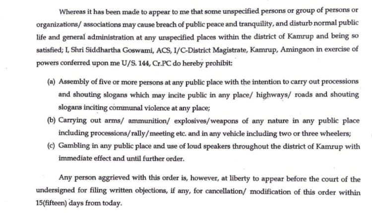 কোনো অসাধু লোক, সংগঠন ইত্যাদিয়ে যাতে ৰাজহুৱা শান্তি –শৃংখলা ভংগ কৰিব নোৱাৰে তাৰ প্রতি লক্ষ্য ৰাখি কামৰূপ জিলাৰ ভাৰপ্রাপ্ত জিলা দণ্ডাধীশ সিদ্ধাৰ্থ গোস্বামীয়ে যোৱা ১২ জুনৰ পৰা কাৰ্যকৰী হোৱাকৈ জিলাখনত ফৌজদাৰী কাৰ্য্যবিধিৰ ১৪৪ ধাৰাৰ অধীনত কেতবোৰ নিষেধাজ্ঞা জাৰি কৰিছে ৷ এই নিষেধাজ্ঞাৰ অধীনত কোনো ৰাজহুৱা স্থানত শোভাযাত্ৰা বা শ্ল’গান আওৰোৱাৰ উদ্দেশ্যেৰে ৫ জন বা ততোধিক লোক সমৱেত হোৱা , ৰাজহুৱা স্হানত মাৰনাস্ত্ৰ , আগ্নেয়াস্ত্র লোৱা ,বিস্ফোৰক সামগ্রী কঢ়িওৱা , শোভাযাত্ৰা উলিওৱা , সভা-সমিতি পতা, শ্লোগান দিয়া আৰু লাউড স্পিকাৰ ইত্যাদি ব্যৱহাৰ কাৰ্যৰ ওপৰত নিষেধাজ্ঞা আৰোপ কৰা হৈছে বুলি কামৰূপ জিলা প্রশাসনে জনাইছে । এই আদেশটো সমগ্র কামৰূপ জিলাতে তৎকালীন ভাৱে বলবৎ কৰা হৈছে বুলি কামৰূপ জিলা প্রশাসনে জনাইছে।