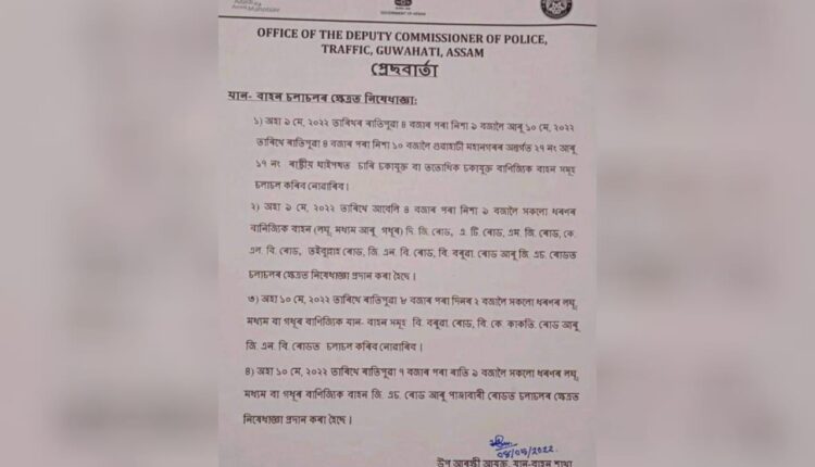 KLB ৰোড, তাইবুল্লাহ ৰোড, GNB ৰোড, বি বৰুৱা ৰোডতো নিষেধাজ্ঞা। ৯ মে’ত GS ৰোডতো পুৱা ৪ বজাৰ পৰা নিশা ৯ বজালৈ নিষেধাজ্ঞা।১০ মে’ত পুৱা ৮ বজাৰ পৰা ২ বজালৈ বাণিজ্যিক বাহনৰ চলাচল বন্ধ।বি বৰুৱা ৰোড, BK কাকতি ৰোড, GNB ৰোডত বাণিজ্যিক বাহনৰ চলাচল বন্ধ।GS ৰোড আৰু পাঞ্জাবাৰী ৰোডত বাণিজ্যিক বাহনৰ চলাচল ১০ মে’ত বন্ধ থাকিব।