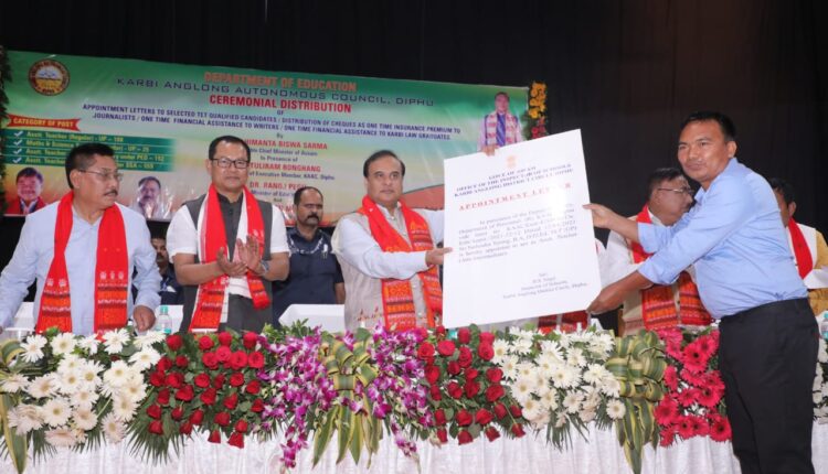 মুখ্যমন্ত্ৰী ড° হিমন্ত বিশ্ব শৰ্মাই কালি কাৰ্বি আংলং জিলাৰ ডিফুৰ জয়সিং দলৈ প্ৰেক্ষাগৃহত অনুষ্ঠিত এক কাৰ্যসূচীত কাৰ্বি আংলং স্বায়ত্ত শাসিত পৰিষদৰ অন্তৰ্গত ৮৮৪ গৰাকী টেট উৰ্ত্তীণ শিক্ষকক নিয়মীয়া আৰু ঠিকাভিত্তিত পদত নিযুক্তি প্ৰদান কৰে।এই শিক্ষক সকলৰ ভিতৰত উচ্চ প্ৰাথমিক বিদ্যালয়ত১০৮ গৰাকীক সহকাৰী শিক্ষক হিচাপে আৰু ৫৫৯ গৰাকীক সৰ্বশিক্ষা অভিযানৰ অধীনত ঠিকাভিত্তিত সহকাৰী শিক্ষক হিচাপে নিযুক্তি দিয়া হৈছে।এই অনুষ্ঠানতে মুখ্যমন্ত্ৰীয়ে জনসংযোগ বিভাগৰ পঞ্জীয়নভুক্ত তথা স্বীকৃতিপ্ৰাপ্ত ৩২ গৰাকী সাংবাদিকক এক কালীন আৰ্থিক সাহাৰ্য্য আৰু কাৰ্বি আংলং তথা পশ্চিম কাৰ্বি আংলং জিলাৰ ৩৪ গৰাকী বিশিষ্ট লেখকৰ ১ লাখ টকাকৈ আৰ্থিক সাহাৰ্য্য আগবঢ়ায়।ইয়াৰ উপৰি মুখ্যমন্ত্ৰীয়ে নিহত সাংবাদিক সকলৰ পৰিয়ালক ৫০ হাজাৰ টকাকৈ আৰু ৮৮ গৰাকী আইনৰ ডিগ্ৰীধাৰীক ১৫ হাজাৰ টকাকৈ আৰ্থিক সাহাৰ্য্য প্ৰদান কৰে।