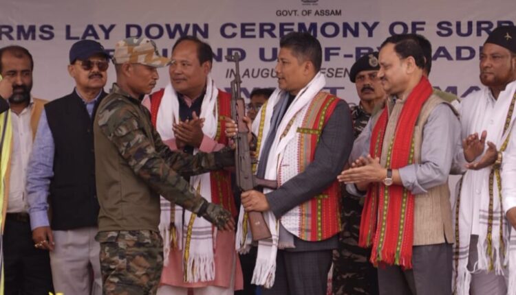 বৰাকৰ দুই উগ্ৰপন্থী সংগঠন BRAU আৰু UDLF (B)ৰ মুৰব্বী সহ ১১৭৯ কেডাৰৰ আত্মসমৰ্পন, ৩৩৫ মাৰণাস্ত্ৰ সম্বৰণ