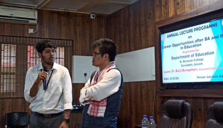 The annual lecture Program 2023-2024 of the Department of Education of B. Borooah College was held on 23 March and the resource person for the annual lecture was Dr. Buljit Buragohain, a prominent career counsellor of the state and and Head, Department of Mechanical Engineering of Assam Don Bosco University School of Technology . Dr. Rupa Baruah Head, Department of Education, B. Borooah College gave the opening speech of the Lecture Program and the introduction of resource person was given by Dr. Devika Phukan, Assistant Professor, Department of Education of B. Borooah College. Dr. Buljit Buragohain discussed career opportunities for undergraduate and postgraduate degree holders in the subject of education. He also mentioned the need for general knowledge in various competitive examinations and interviews conducted for recruitment. The Program was attended by the students of the Department of Education, B. Borooah College and Arya Vidyapeeth College . Dr. Buragohain responded to various queries by the students and gave valuable career related suggestions. He also informed about the free Career Counselling over phone (9435188630) on every Saturday from 6 PM to 9 PM.